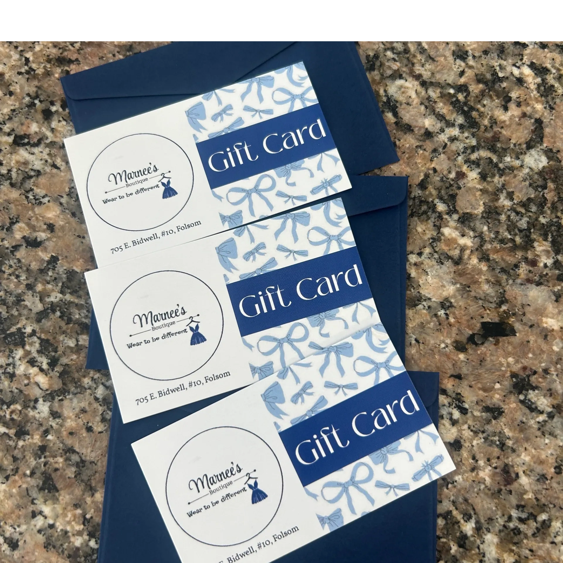Looking for a unique gift? Give the gift of fashion with a Marnee's Boutique gift card. Available in different amounts, these gift cards are redeemable for any of our items.